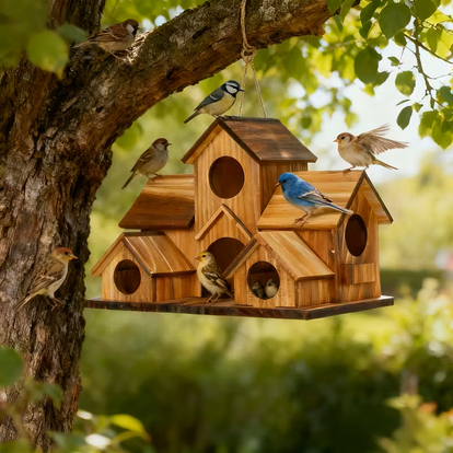 Lintutalo, 5-reikäinen linnutalo ulkoruokinta-alueelle . Käsinmaalattu puinen säänkestävä lintulauta , sopii puutarhan ja pihan-alueen koristeeksi. Mitat : 25x19x16cm