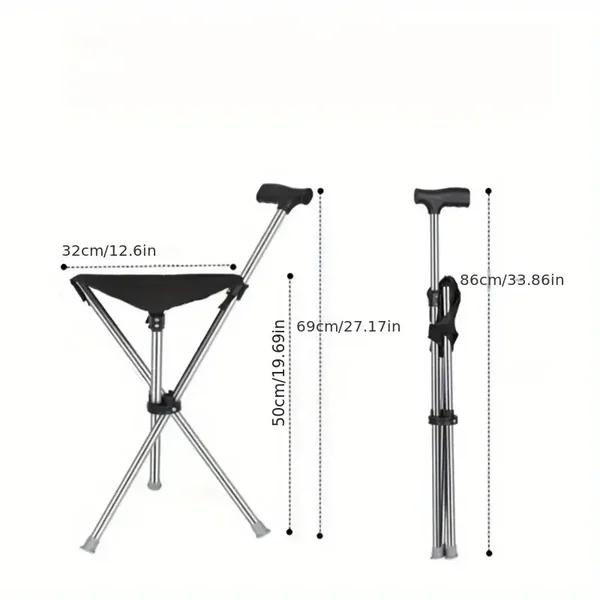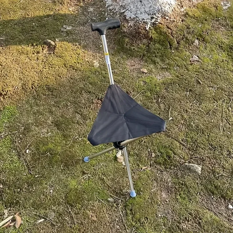 Mukana kulkeva,kätevä kolmijalkainen kävelykeppi/ Festivaali-istuin samassa . Kevyt alumiinirakenne, istuinosa vankalla  Oxford -kankaalla, käyttö mm. lepoistuimena tapahtumissa ja monikäyttöisenä kävelykeppinä.