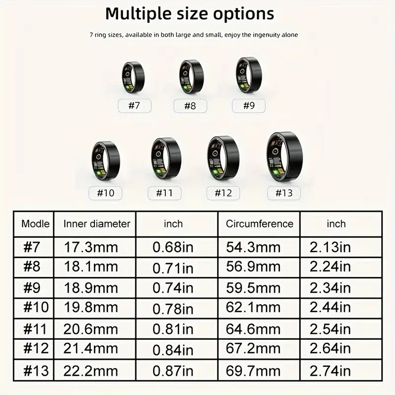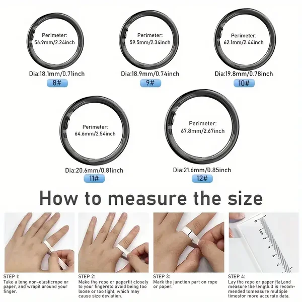 - Pitkäkestoinen akku: Sormus on suunniteltu pitämään akun kestävyys pitkään, jotta voit seurata kuntoilua ja aktiivisuutta ilman huolta akun loppumisesta.