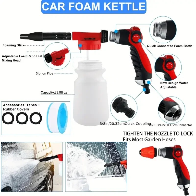 Vaahtopistooli: Jatkuva vaahdotus helpottaa auton pesua ja suojaa maalipintaa.