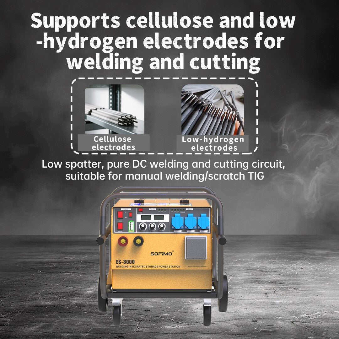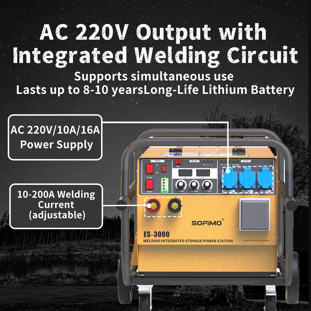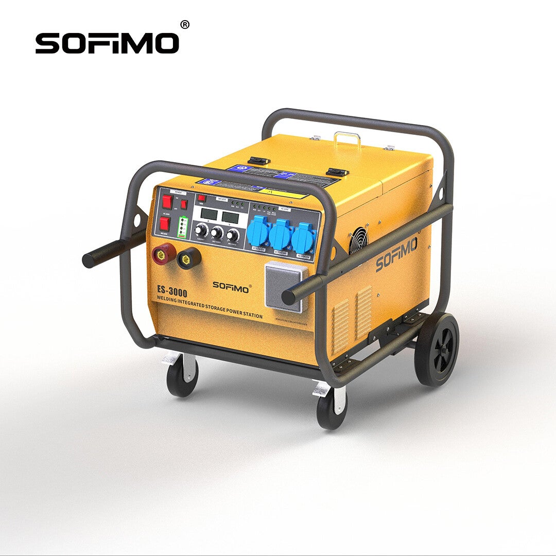 SOFIMO ES‑3000 yhdistää hitsauskoneen ja teollisen virransyöttöaseman samaan laitteeseen. Se on suunniteltu raskaaseen käyttöön: putkilinjat, petrokemian laitokset, teollisuusalueet, huoltotyöt ja paikat, joissa tarvitaan sekä hitsausta että 220V virtaa — ilman generaattoria.