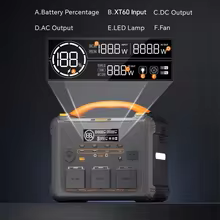 A. Akun varausprosentti B. XT60-sisääntulo (aurinkopaneelit) C. DC-ulostulo D. AC-ulostulo E. LED-valo F. Jäähdytyspuhallin